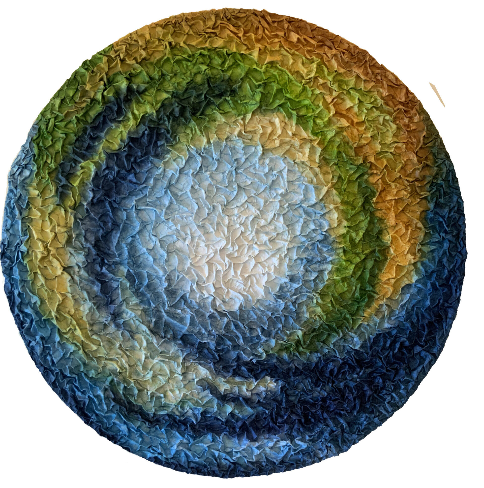 aber auch ohne vorherige Färbung in Form gebracht. Durch gefaltete Papier-Landschaften mit “Tälern, Bergen oder Schluchten” entsteht eine dritte Dimension im Bild.